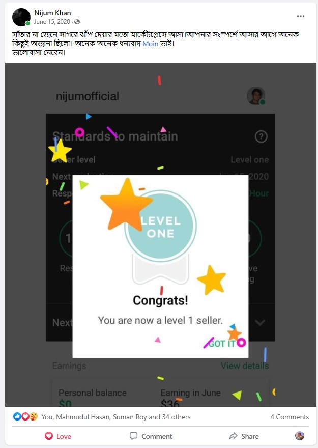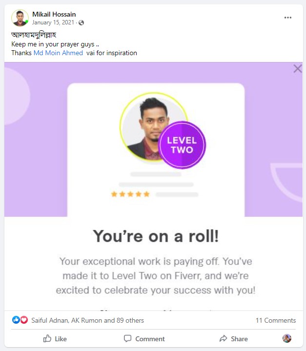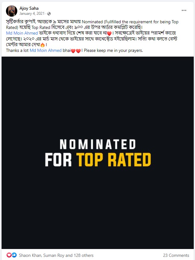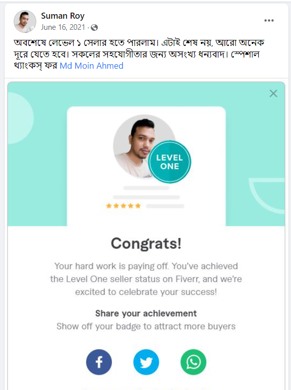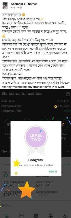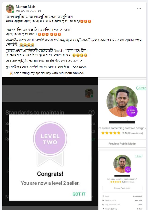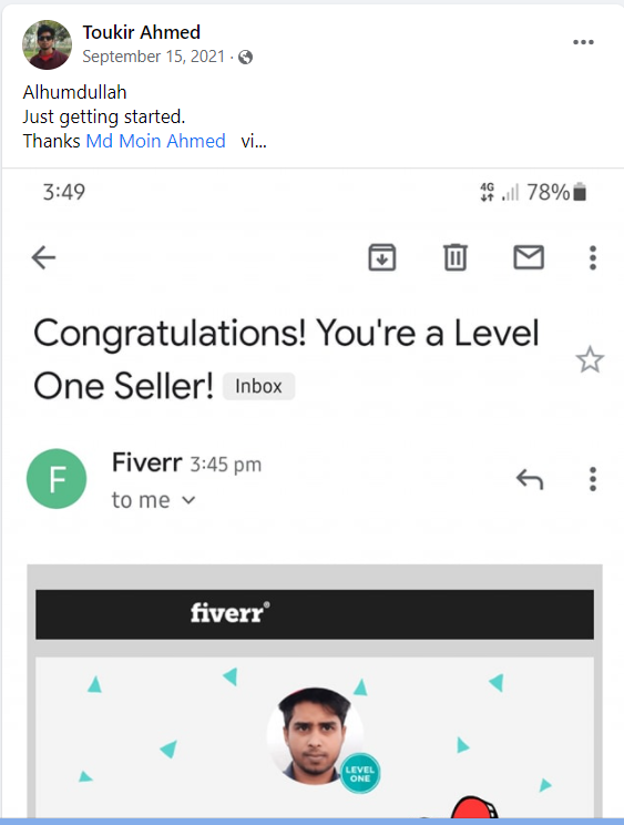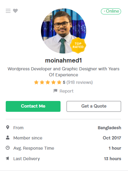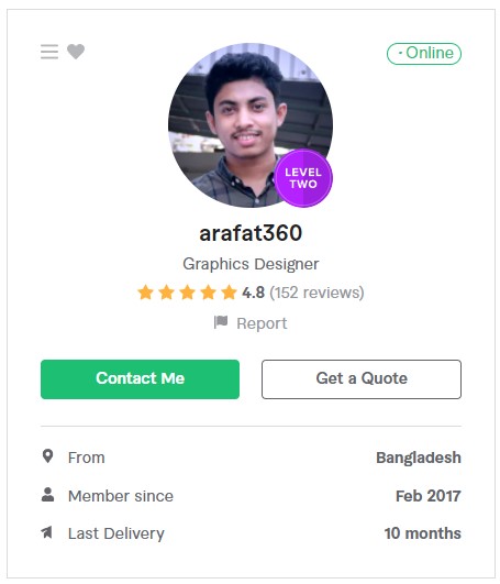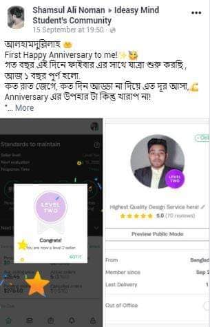 আমি ২০১৭ সাল থেকে ফাইভার মার্কেটপ্লেস এ গ্রাফিক ডিজাইনার হিসেবে ফ্রিল্যান্স ক্যারিয়ার শুরু করি এবং  দেড় বছরেরর মধ্যেই ২০১৯ সালের ফেব্রুয়ারী মাসে  টপ রেটেড নমিনেশন পাই। এবং বর্তমাসে টপ রেটেড সেলার হিসেবে মার্কেটপ্লেস এ একজন গ্রাফিক ডিজাইনার এবং ওয়েবসাইট মেকার হিসেবে কাজ করে যাচ্ছি।