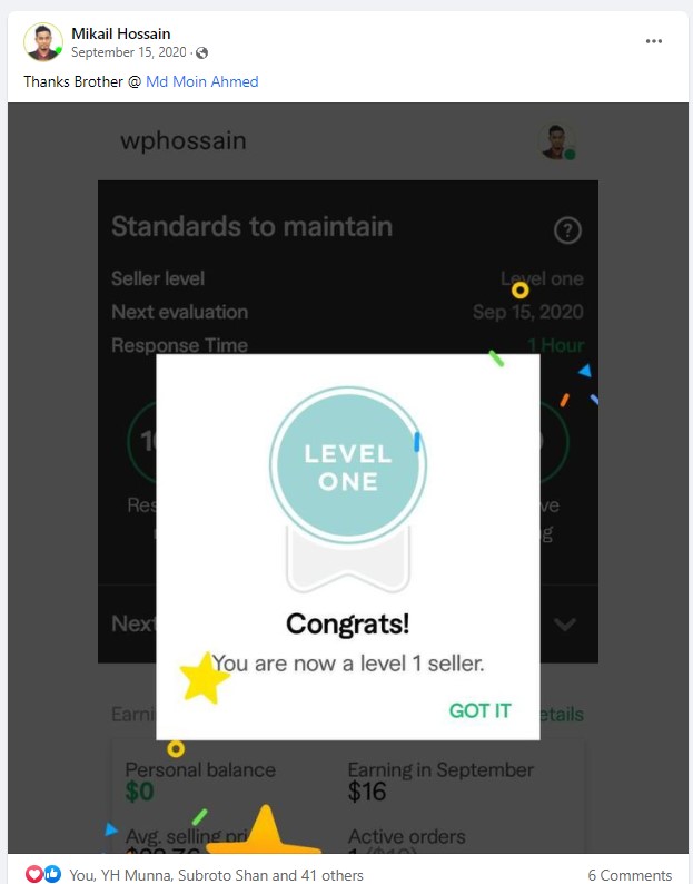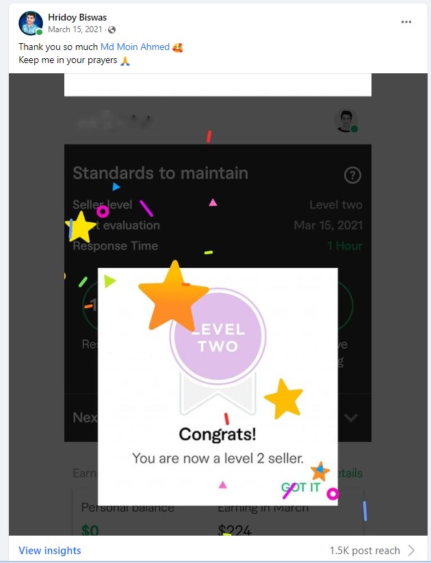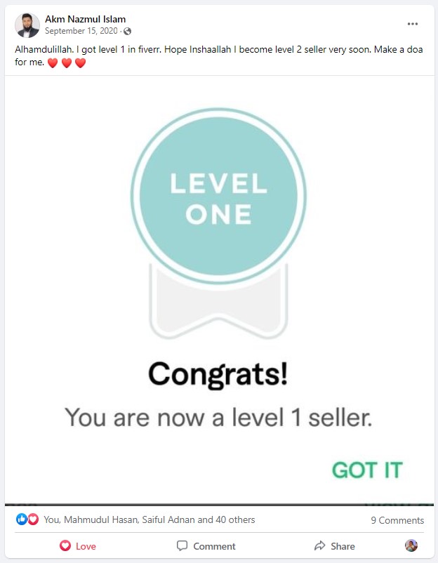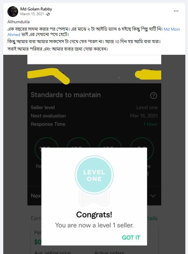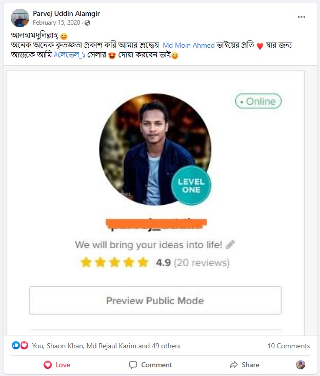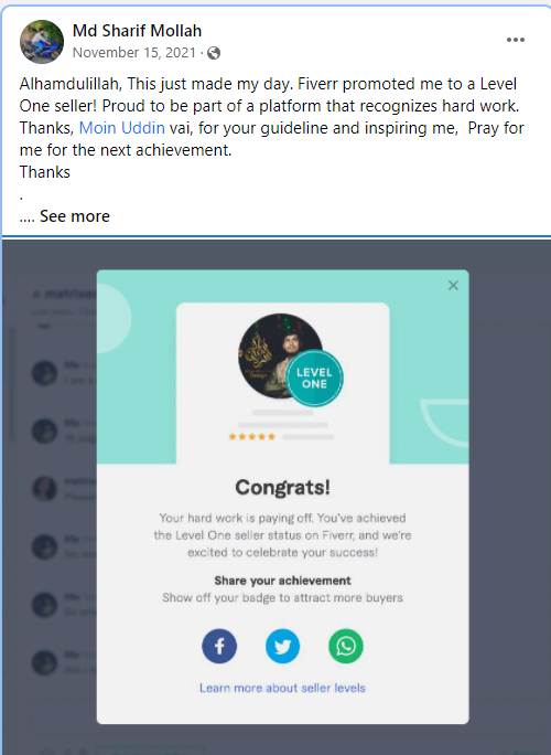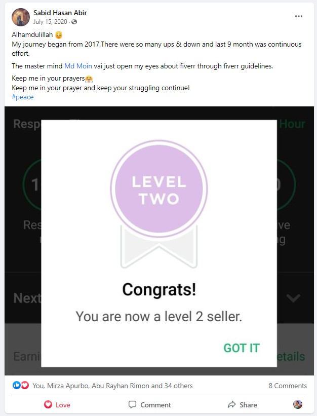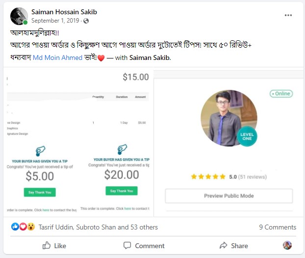 আমি ২০১৭ সাল থেকে ফাইভার মার্কেটপ্লেস এ গ্রাফিক ডিজাইনার হিসেবে ফ্রিল্যান্স ক্যারিয়ার শুরু করি এবং  দেড় বছরেরর মধ্যেই ২০১৯ সালের ফেব্রুয়ারী মাসে  টপ রেটেড নমিনেশন পাই। এবং বর্তমাসে টপ রেটেড সেলার হিসেবে মার্কেটপ্লেস এ একজন গ্রাফিক ডিজাইনার এবং ওয়েবসাইট মেকার হিসেবে কাজ করে যাচ্ছি।