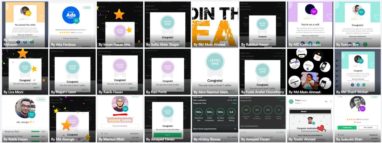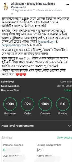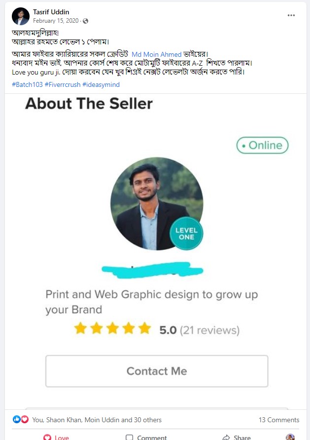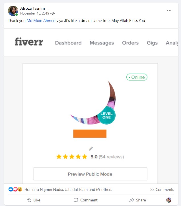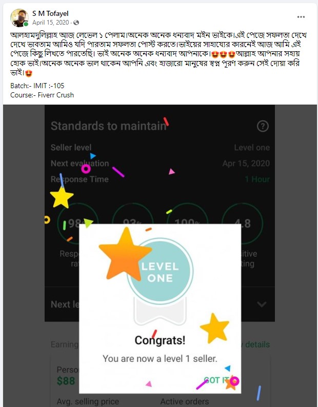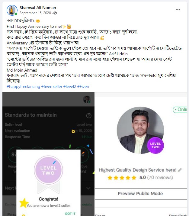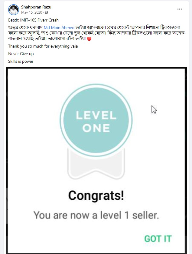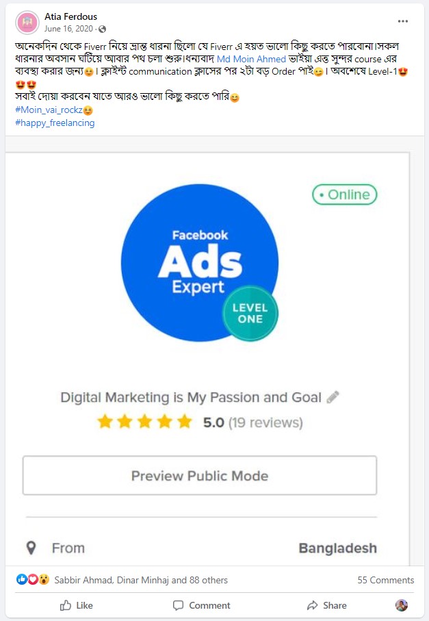 ২০১৮ সালের নভেম্বর মাসে আমি প্রথম ফাইভার ক্রাশ কোর্স নেই যেই ব্যাচ থেকে ৮৭% শিক্ষার্থী ফাইভার এ প্রথম কাজ পাওয়ার মাধ্যমে জার্নি শুরু করে। এবং আলহামদুলিল্লাহ তাদের মধ্যে অনেকেই এখন টপ রেটেড সেলার বা প্রোফাইলে ৫০০+ রিভিউ এর অধিকারী।