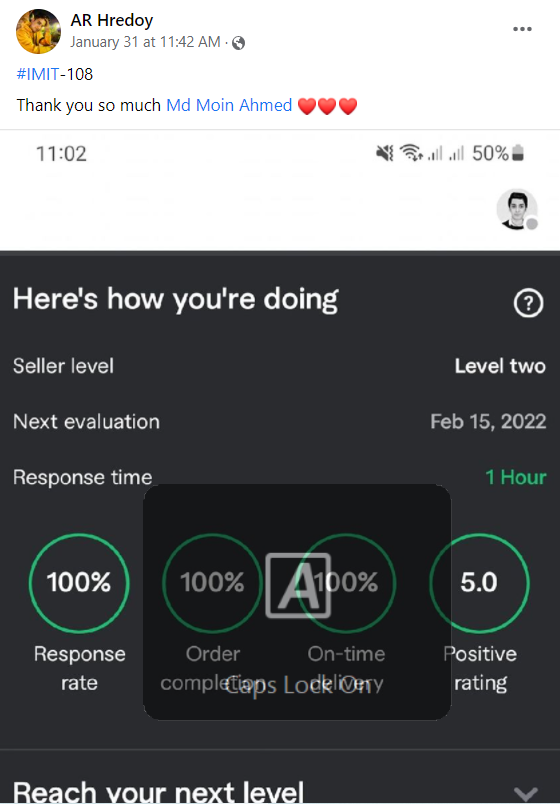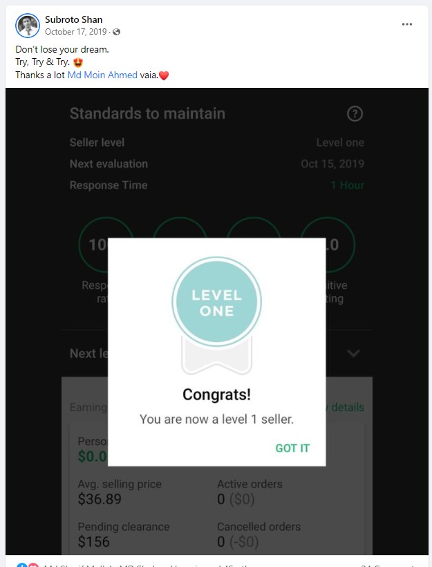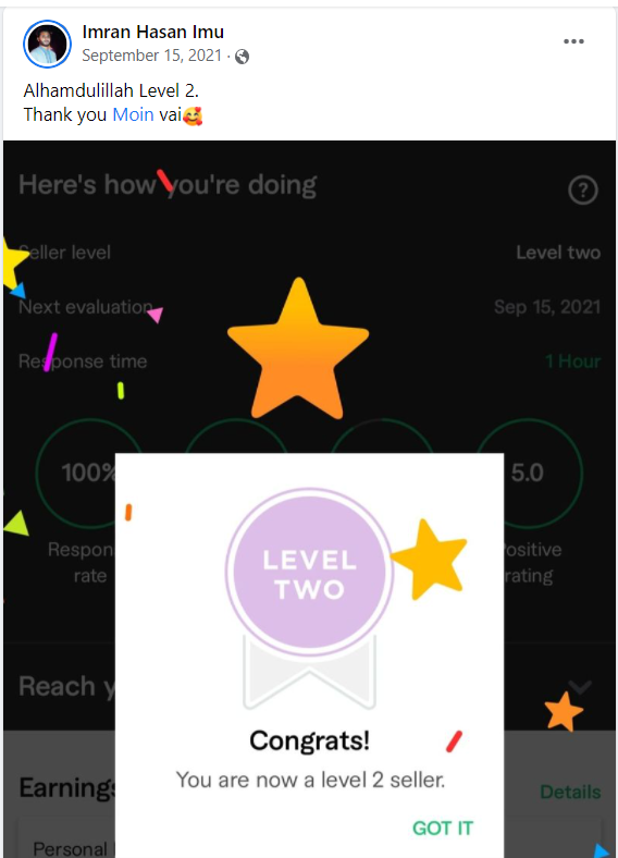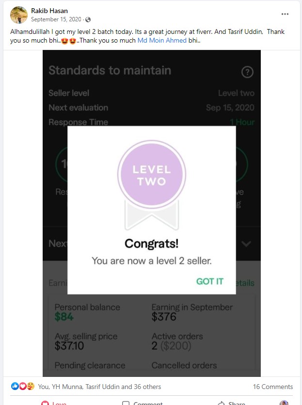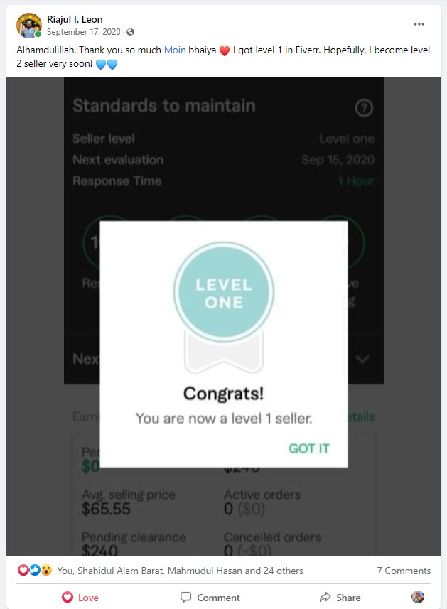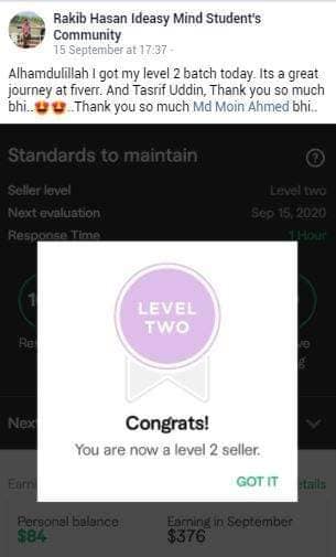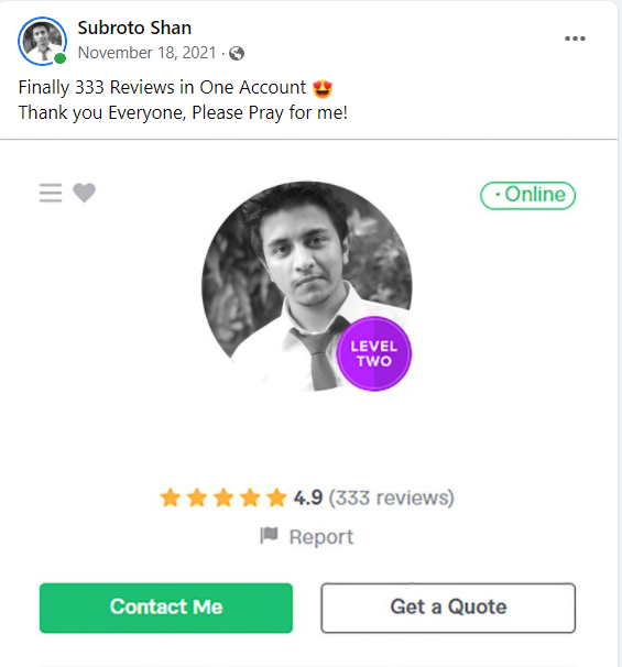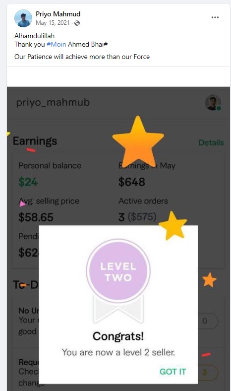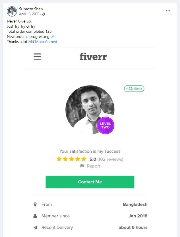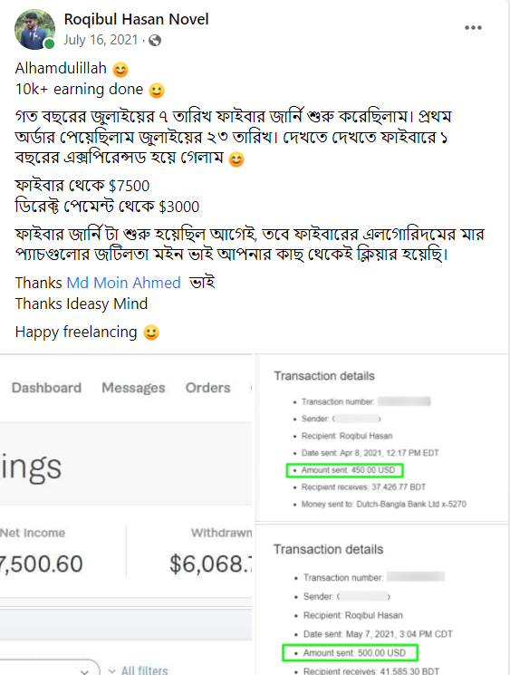 ২০১৮ সালের নভেম্বর মাসে আমি প্রথম ফাইভার ক্রাশ কোর্স নেই যেই ব্যাচ থেকে ৮৭% শিক্ষার্থী ফাইভার এ প্রথম কাজ পাওয়ার মাধ্যমে জার্নি শুরু করে। এবং আলহামদুলিল্লাহ তাদের মধ্যে অনেকেই এখন টপ রেটেড সেলার বা প্রোফাইলে ৫০০+ রিভিউ এর অধিকারী।