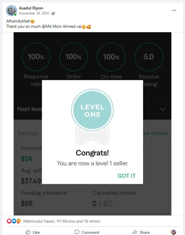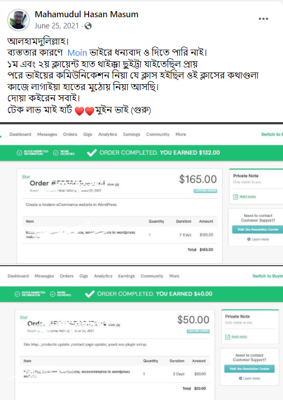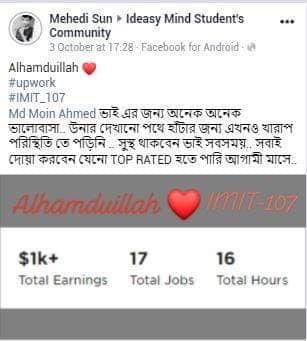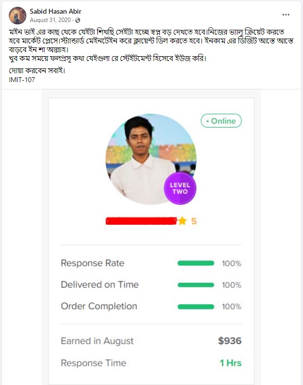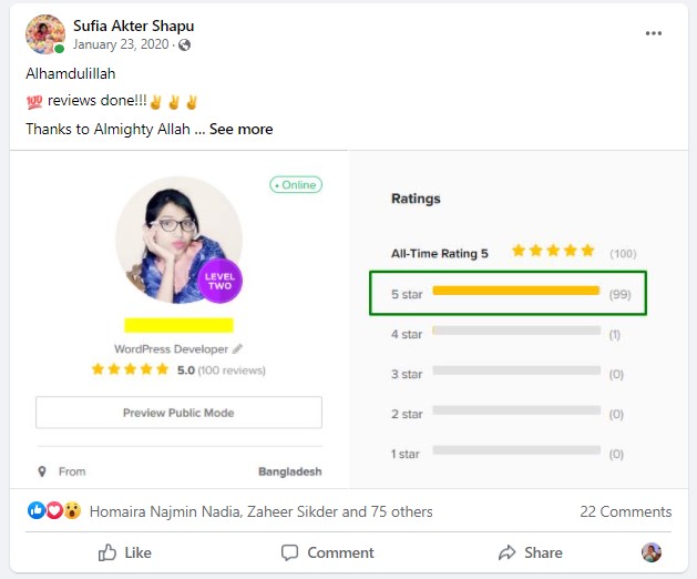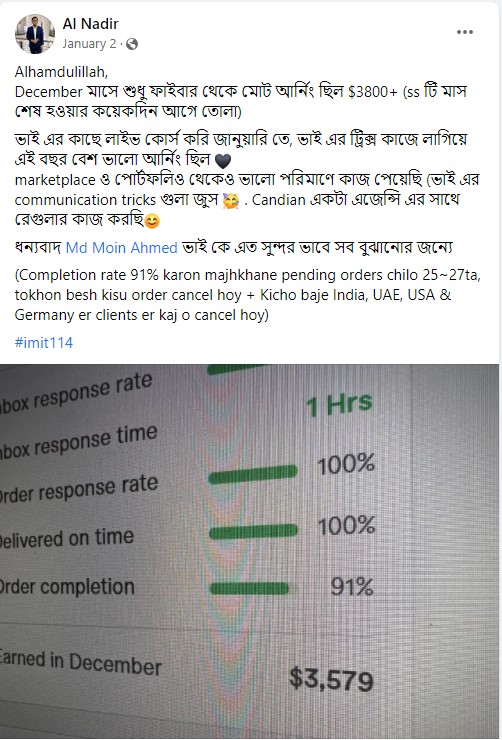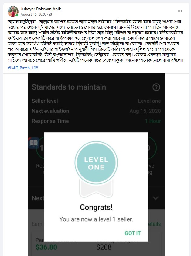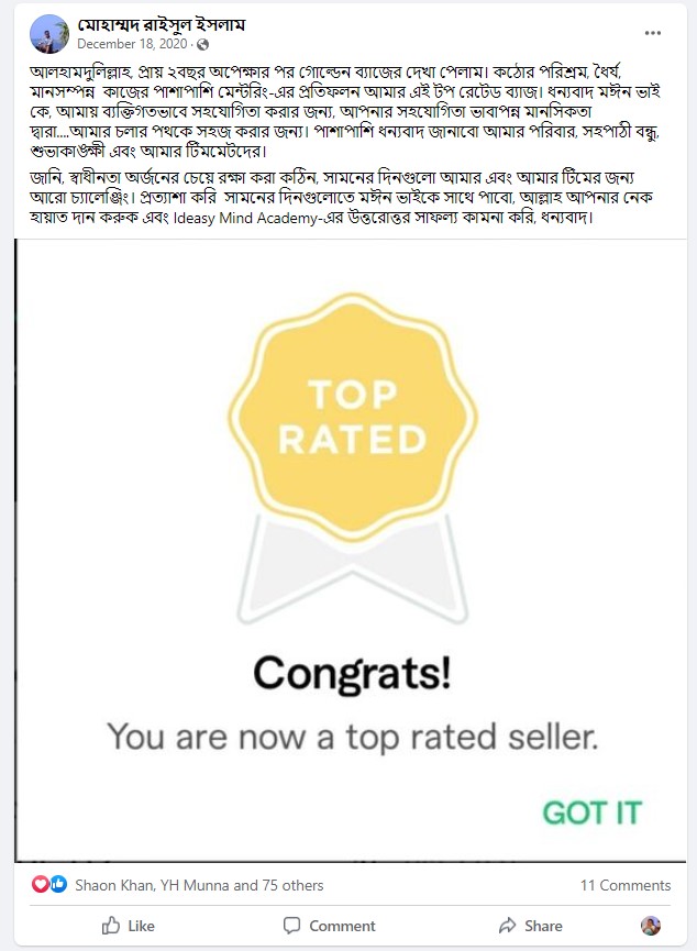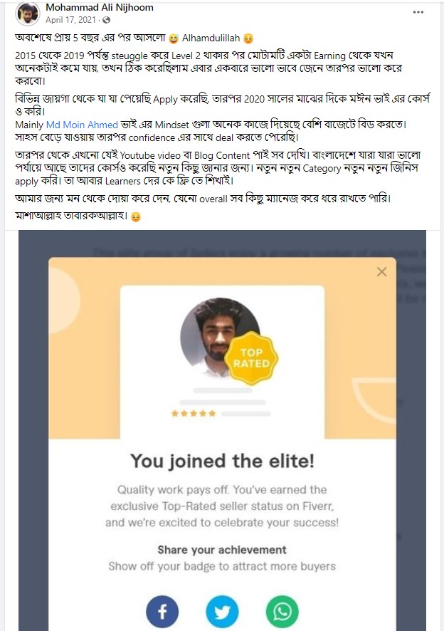 আলহামদুলিল্লাহ এ পর্যন্ত ১০০০+ শিক্ষার্থীকে শেখানোর সুযোগ হয়েছে যাদের মধ্যে টপ রেটেড ব্যাজ সহ নূন্যতম একটি ব্যাজ রয়েছে এমন শিক্ষার্থীর সংখ্যা ৪০০+ । এদের মধ্যে অনেকেই মাসিক ৬ ডিজিট অতিক্রম করে সফলতার সাথে ফ্রিল্যান্সিং কে ক্যারিয়ার হিসেবে বেছে নিয়েছে।