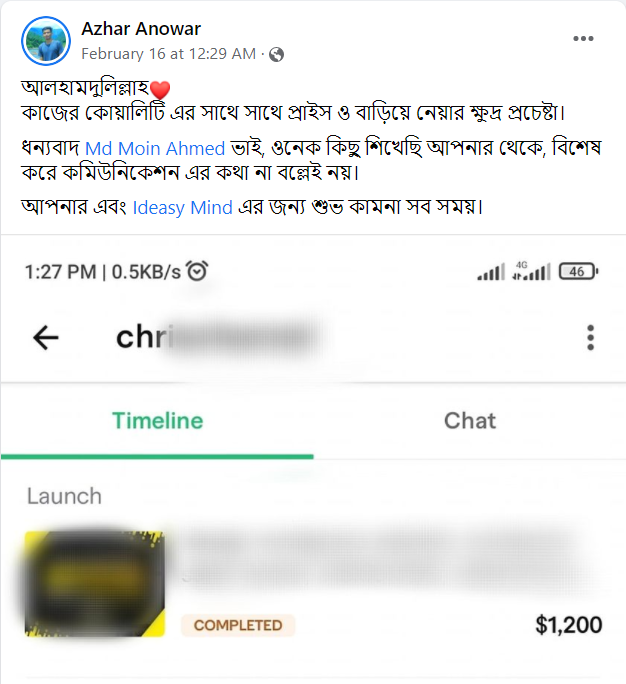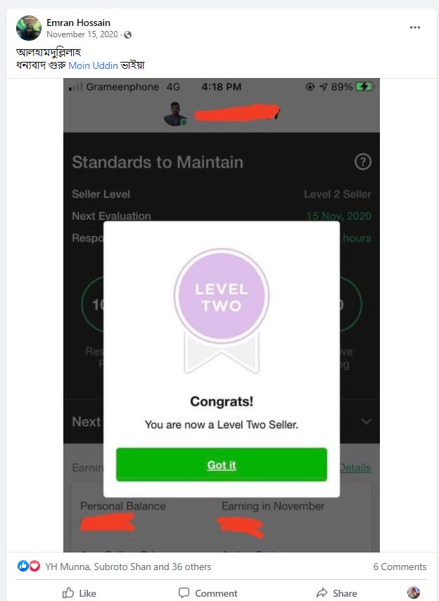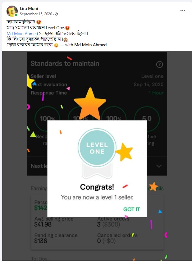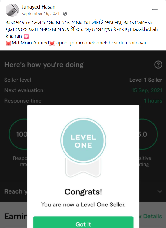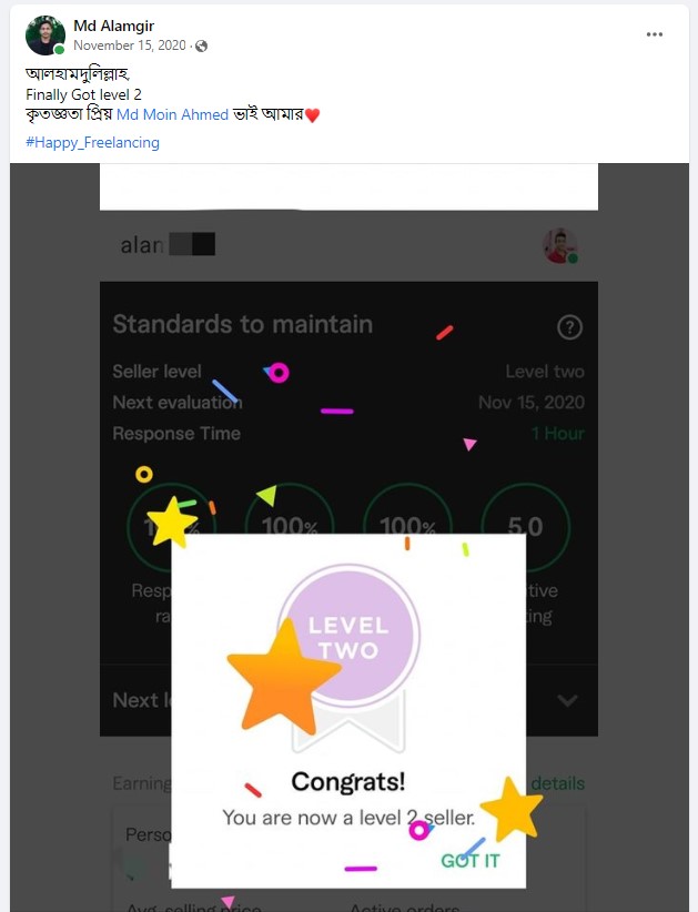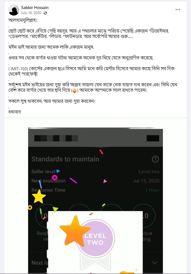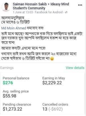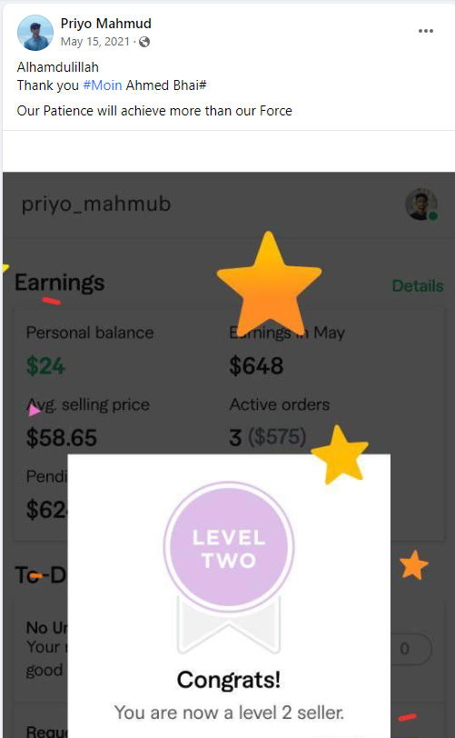 আলহামদুলিল্লাহ এ পর্যন্ত ১০০০+ শিক্ষার্থীকে শেখানোর সুযোগ হয়েছে যাদের মধ্যে টপ রেটেড ব্যাজ সহ নূন্যতম একটি ব্যাজ রয়েছে এমন শিক্ষার্থীর সংখ্যা ৪০০+ । এদের মধ্যে অনেকেই মাসিক ৬ ডিজিট অতিক্রম করে সফলতার সাথে ফ্রিল্যান্সিং কে ক্যারিয়ার হিসেবে বেছে নিয়েছে।
